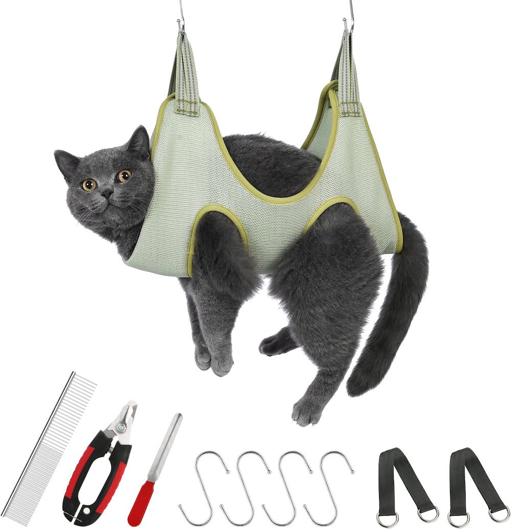This Guzekier Pet Dog Grooming Hammock Harness for Cats & Dogs is the best way to keep your cat restrained while you trim their nails, groom them, or check their eyes and ears for health issues.
